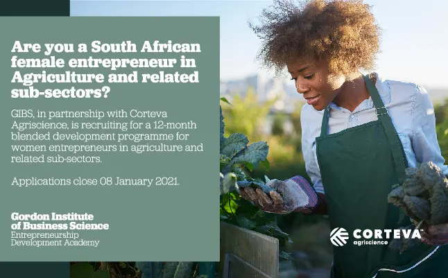 The Gordon Institute of Business Science (GIBS), in partnership with Corteva Agriscience, is recruiting women entrepreneurs in agriculture and related industries for a 12-month blended development programme.