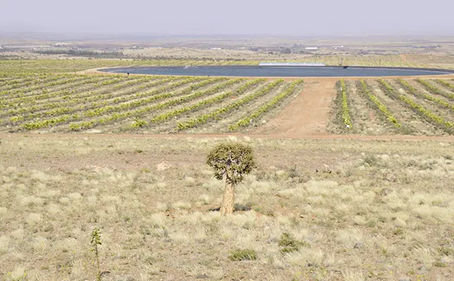 This was dug by impoverished white farmers who were hit by the rinderpest of the 1890s and were settled in Kakamas by the Dutch Reformed Church. The water is pumped through an 800mm diameter pipe to an on-farm dam with a capacity of 113 000m³. It is the largest dam lined with plastic in the Northern Cape, Rabie says. The vines and citrus trees are watered via micro-irrigation. Regular soil analyses are conducted and fertigation is also applied. The choice of cultivars planted was taken solely on the marketability of the grapes and citrus, Rabie explains.