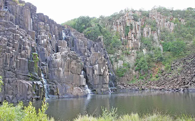 Water from the furrow flows into the pipes, which run parallel to each other down a steep slope immediately adjacent to Mooi Falls.