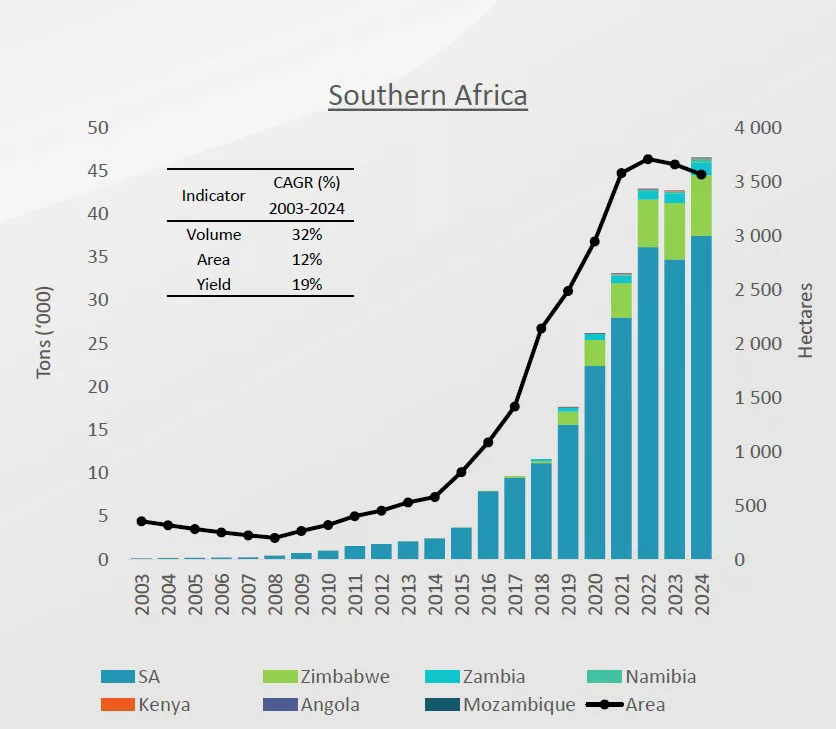 Research conducted by Louw Pienaar, senior analyst at the Bureau for Food and Agricultural Policy (BFAP), showed that Southern Africa (including South Africa, Namibia, Zimbabwe, Kenya, Angola, and Mozambique) represented about 10% of the Southern Hemisphere’s blueberry supply.