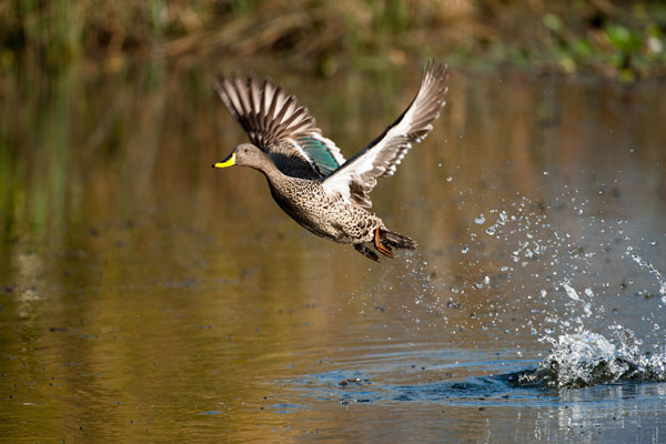| Name: Yellow-billed Duck (Anas Undulata) Description: has a distinctive bright yellow bill and a speckled brown head.Habitat – open water in pans and slow flowing rivers.Voice – male gives low whistles; females quack loudly. |