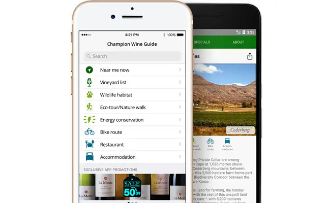 The Champion Wine Farm Guide is a GPS-enabled Android or iOS app featuring all 38 Conservation Champion wine farms.