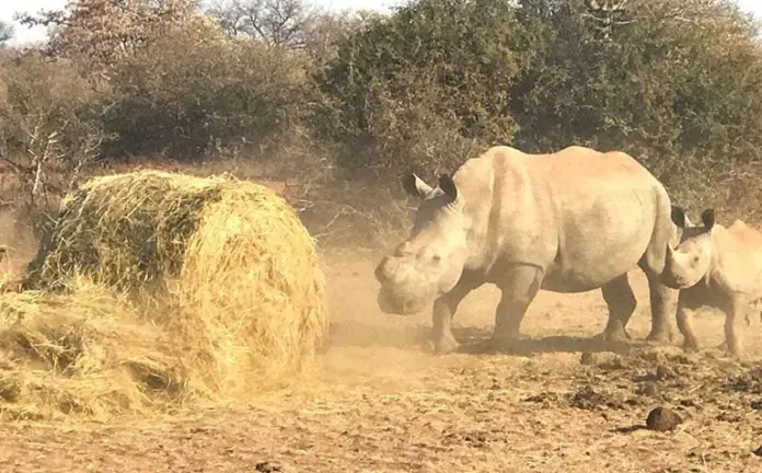 One rhino required at least one 300kg bale of feed every 24 hours. At the moment, three 300kg bales were used for 10 to 15 animals per 24 hours.