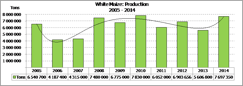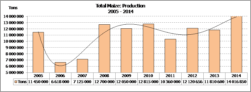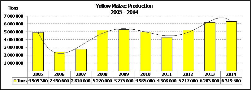 The area estimated for maize remained unchanged at 2,688 million hectares, while the yield is 5,21t/ha. Production forecast for white maize remained unchanged at 7,697 million tons, while yellow maize showed an increase of 2,05% or 126 700t more than the previous year.