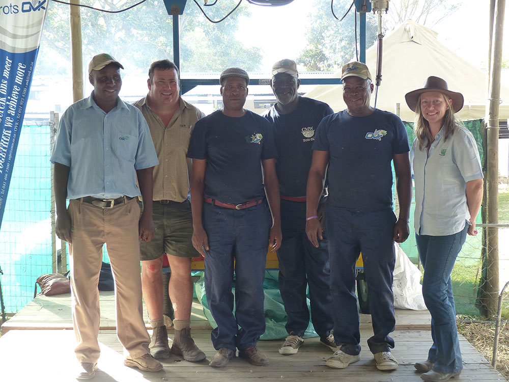 The CMW team which performed sheep shearing demonstrations at the BAS are Tankiso Manyali (CMW driver) Gary Willows (CMW Technical Field Officer), Petros Nkoi (CMW Classing Instructor) Elliot Ntsombo (CMW Blade Shearing Instructor and five-time World Blade Shearing Champion), Charles August (Machine Shearing Instructor and five-time SA Machine Shearing Champion) and Donna Green (CMW Shearing Services).