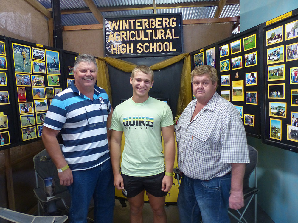 The Winterberg Agricultural High School (WAHS) from Fort Beaufort in the Eastern Cape was one of many exhibitors at the 2016 BAS. From left are Fred Every (WAHS headmaster), Kallie Schwab (WAHS deputy headboy) and Dani Nortier (WAHS teacher).
