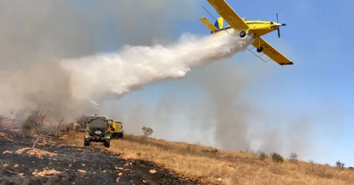 Two aircrafts, each releasing about 56 loads consisting of 1 500l of water at a time, had to be called in to bring the fire under control.
