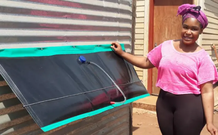 It’s mounted on the northern side of a house. It is then filled with water and provides hot water hours later. At only R700 the geyser pays for itself in three to five months.