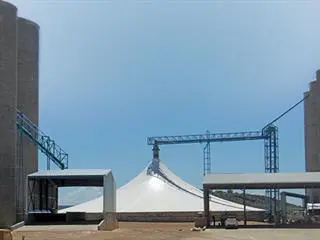 The core of the wall is made from steel mesh. The structure has the functionality of a conventional silo and is more permanent than a grain bunker. It also boasts less grain loss. The tentsilo has a diameter of 60m and can accommodate up to 18 500t of grain, nearly four times the amount of a regular storage unit.