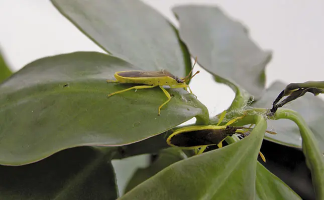 One reason Pereskia is a problem in South Africa is that no insects feed on the plant here. In its native habitat, insects and pathogens feed extensively on it, and it never reaches high densities. The Pereskia stem-wilter is one example; this sucking bug destroys the growing tips of the cactus, stunting growth and reducing its ability to compete with other plants.