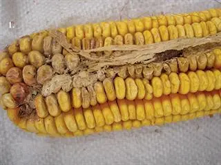 Fusarium ear rot (pictures 3 and 4) occurs after flowering and is most severe under hot, dry weather conditions. It is mainly caused by Fusarium verticillioides, although F. subglutinans and F. proliferatum are also important. F. verticillioides can live without showing symptoms on the maize plant.