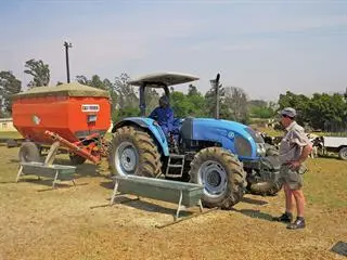 The discharge rate of the material is monitored by load cells on the axle with the Libra Measuring Instruments display showing the amount discharged in 5kg increments. This allows the operator to dispense the amount specified for each paddock and place the required quantity in each feed bin.