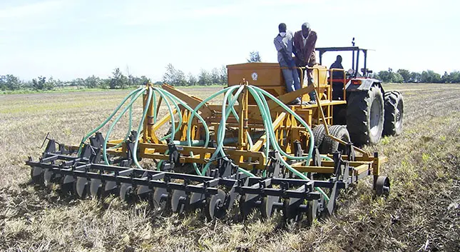 Ndume air seeders consist of a seed and fertiliser box on wheels with a simple three-point linkage system on the back. Because they are trailed units, they can carry a fair load of seed and fertiliser, yet be pulled by a relatively small tractor.