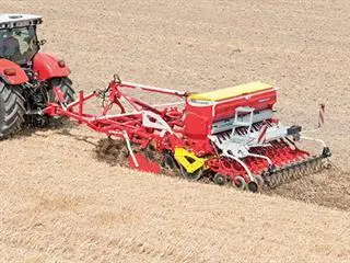 The Multiline is trailed from a drawbar attached to a Cat III lower linkage and can also be used behind smaller Cat II tractors. The machine is raised hydraulically and the unit, carried on the rubber packer roller, provides a ground clearance of 250mm. Pöttinger Vitasem A or Vitasem ADD seed drills are installed as standard above the packer roller, and can be removed easily so that the trailed stubble cultivator can be used on its own.