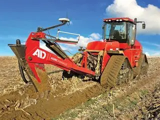 The Quadtrac tractor has sufficient power to pull the Tile Plow at the required depth. The Tile Plow consists of a heavy-duty, sub-soiler tine raised and lowered by the tractor’s hydraulics, with the working depth automatically controlled by computer.