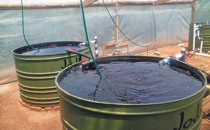 In a traditional aquaponics set-up, small, high-sided, circular plastic tanks of about 1 500ℓ each are used for fish culture, and these are coupled to a gravel bed system.