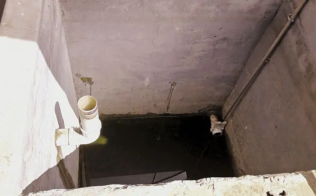 The removal of accumulated waste build-up from a deep-V tank is as simple as turning an upward-pointing pipe downward, or opening a valve.
