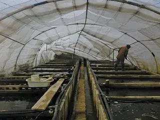 Storm damage to plastic sheeting on tunnels can cause severe stock losses, especially in winter. In summer, loss of the plastic covering immediately exposes the fish to avian and other predation. Bricking up the ends of tunnels with walls and windows can make the tunnel more wind-resistant, but a tunnel is always at risk. Low, hemispherical tunnels are stronger than vertical-sided ones. Plastic sheeting must be tight and smooth, to prevent wind from getting in underneath. Home-made tunnel frames are almost always inferior to curved galvanised or stainless steel frames.