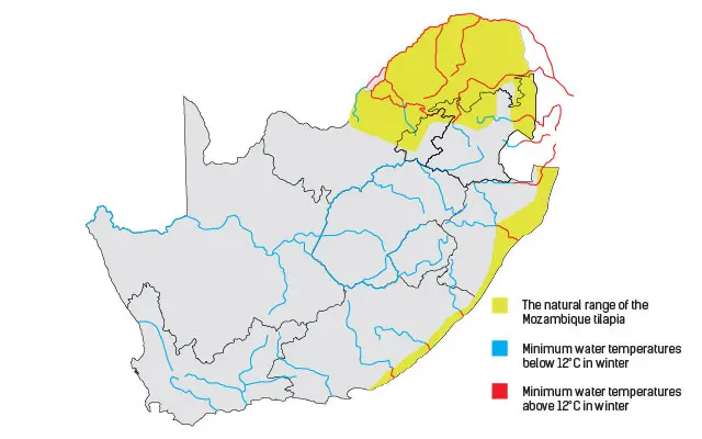 Tilapia are a more complex issue. The species of most interest to aquaculture (Oreochromis niloticus, O. mossambicus and Tilapia rendalli) are severely limited by low temperatures. O. niloticus and T. rendalli will not survive for long at below 12°C. Given the high altitude of the South African plateau, this rules out about 60% of the country.