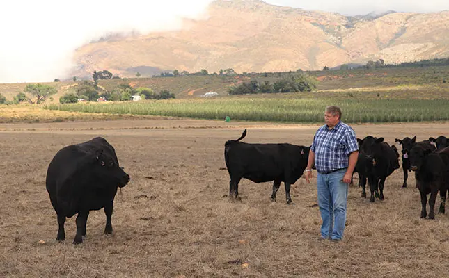 Conditions on Gielie Geldenhuys’s family farm in the Theronsberg region, 30km north of Ceres in the Western Cape, are harsh. Winters are cold, typically with snow, summers are hot, and the grazing comprises sourveld. Faced with these realities in the 1970s, Geldenhuys’s father, Basie, kept a variety of breeds on the farm to test which had the best chance of thriving. In the end, he settled on medium-framed Angus cattle.