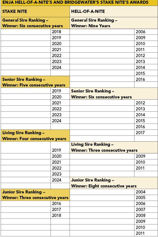 The father-and-son duo, Enja Hell-Of-A-Nite and Bridgewater’s Stake Nite, has made history by achieving what no other father-son duo achieved before: Enja Hell-Of-A-Nite held the General Sire of the Year title for a total of nine years, before conceding the title to his son Bridgewater’s Stake Nite, who has in turn secured the title for the sixth consecutive year. These two sires are the cornerstone of the stud’s breeding philosophy.