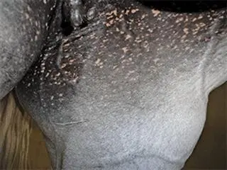 Vitiligo is a skin condition where a loss of melanocytes – the cells that colour the skin – causes smooth white or pink patches. It’s hereditary, but not noticeable at birth and is mostly seen in Arabian horses. In young adulthood, animals with vitiligo develop bleached splotches of skin. These can appear as one or two well-defined patches or occur over large portions of the body. Vitiligo occasionally affects the coat and hooves as well.