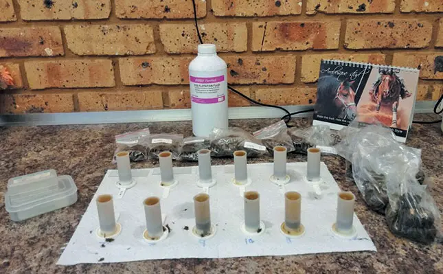 Initially, manure was collected from all the horses. Only roundworm eggs can be counted with faecal flotation, and all horses tested showed high levels of large and small strongyle (worm) eggs, while four horses at the training yard showed the presence of ascarid worms.