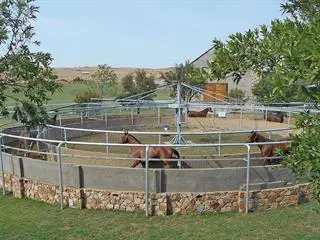 Hot walkers are used throughout the world to exercise horses at a walk and trot. They save time and reduce the number and size of paddocks needed in a training establishment or quarantine station. Instead of a horse being let loose in a large paddock to exercise itself, it can be kept stabled or put outside in a 3m x 4m holding pen and given 40-minute exercise per day with other horses.