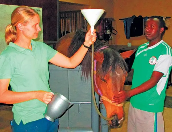 The vet will begin by injecting a tranquilliser and a muscle relaxant. Then he or she will pass a stomach tube through one of the horse’s nostrils and down its oesophagus, hold the head lower than the chest, and pour water and a lubricant down the tube to flush away the obstruction.