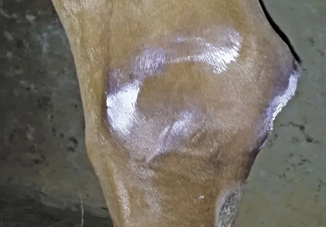 If you allow the hock to heal, the result will be only a cosmetic flaw. Hydro therapy or cold hosing helps reduce the inflammation and limit swelling in the early stages of the injury. I find hot compresses of comfrey and stinging nettle particularly effective. Crush or bruise the comfrey leaves, add a handful of dried stinging nettles, place on a sheet of cotton wool, and pour boiling water over the compress – just enough to dampen the cotton wool.