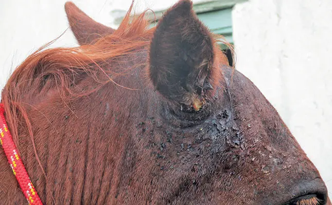 Maggot eggs are squirted deep into the ear, where the larvae hatch and start gorging themselves. Horses rub their ears and faces over branches and fences, making the injury worse.