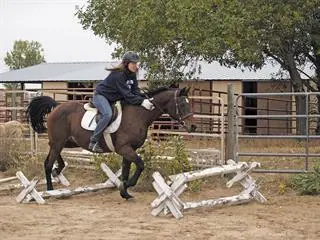 If you prefer, long-line your youngster over the poles initially. Then mount it and ride over the poles. The speed should be no more than a controlled working trot, and there should be a change of rein every five minutes. Use trotting poles at least once a week (once a day if you are training for a competition). Allow one day a week off.