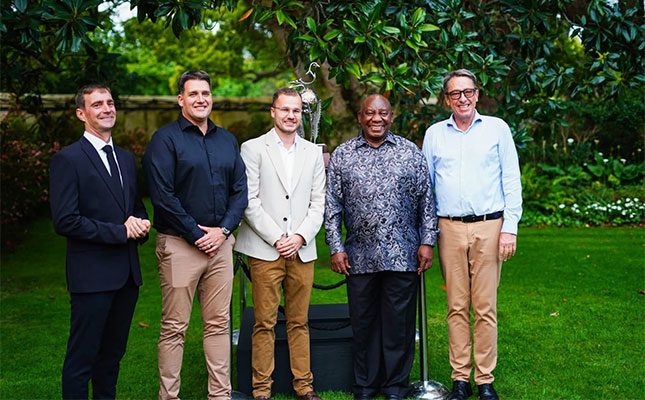 From left: AfrikaPro Premier One Loft series race director Hendrik van Wielligh, Pigeon Palace syndicate members Mark King and Cyle Bellamy, President Cyril Ramaphosa, presenter of the annual race, and syndicate member and attorney Gys Louw. Pigeon Palace won R5,3 million in various categories of the 2025 AfrikaPro series. Not present are syndicate members Bianca Bellamy, Rolien King and Judith Louw.