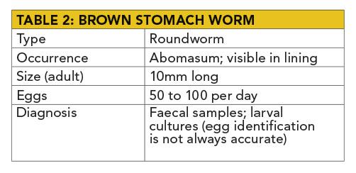 The brown stomach worm (see Table 2) is a roundworm found in the abomasum (fourth/true stomach) of the sheep. It is a small, red-brown worm that’s about 10mm long, and is visible on the lining of the abomasum.