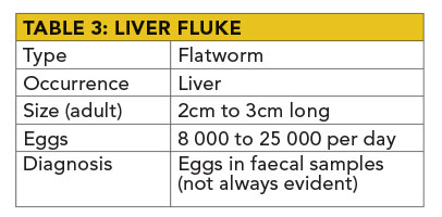 As the name implies, liver fluke (see Table 3) is a flatworm that infects the liver of sheep. Adult fluke are between 2cm and 3cm long, and live in the bile ducts of the infected animal. Eggs are excreted via the animal’s faeces.