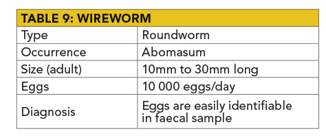 Wireworm (see Table 9), also known as barber’s pole worm, is a roundworm found throughout the world. The parasites attach to the lining of the sheep’s abomasum and feed on blood.