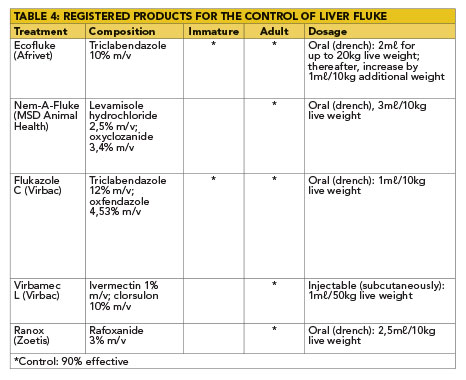 Upon necropsy, severe liver damage may be evident. Mature flukes may be found in the bile ducts of the liver and gallbladder. Treatment requires the administering of the applicable registered products (see Table 4).