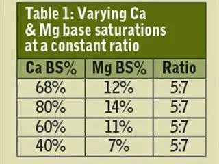 Albrecht specified the ideal amount of calcium and magnesium required to create a healthy soil. This amount is best expressed in terms of the percentage of these positively-charged minerals which attach themselves to the negative charges on soil colloids. This is the base saturation (BS) level. For loam and clay soils, Albrecht recommends that 68% of the total negative charges should be saturated with calcium and 12% with magnesium. Note that 68% + 12% = 80%.