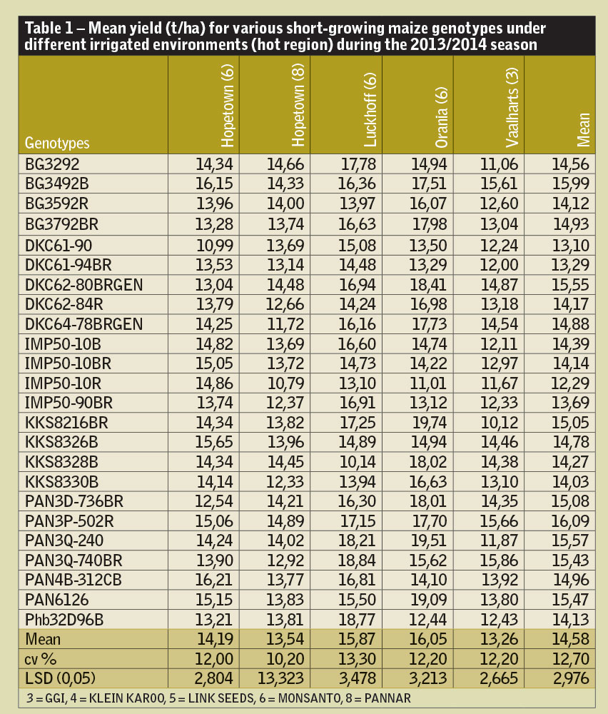 Table 1 shows the yield of 24 short-growing maize hybrids tested on 16 different irrigated sites. Yield potential in the hot region varied from 13,26t/ha at Vaalharts to 16,05t/ha at Orania. In the cool to temperate region, yield varied from 9,47t/ha at Delmas to 15,88t/ ha at Winterton.