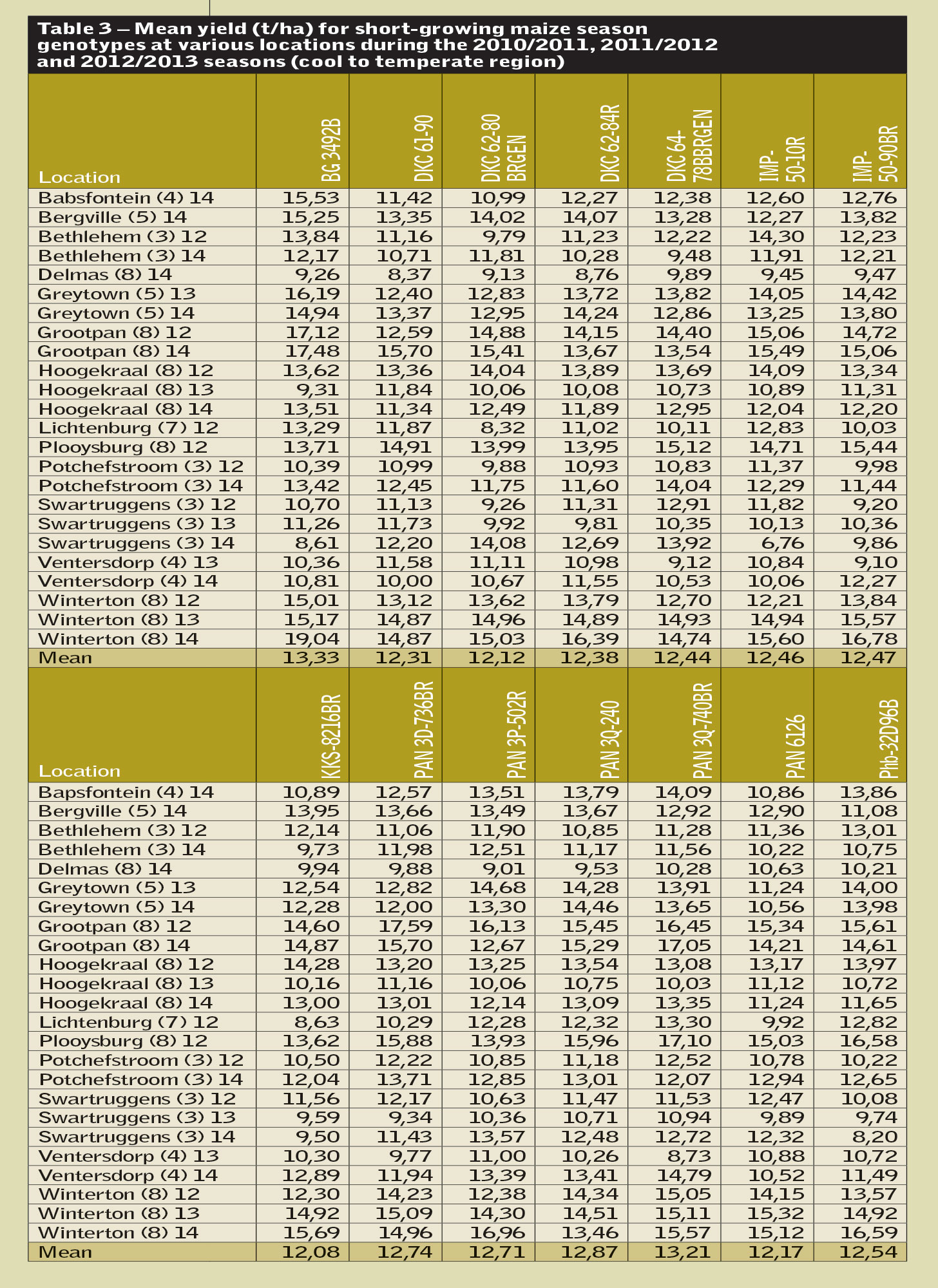 Results of the 2011/2012, 2012/2013 and 2013/2014 National Cultivar Trial series were summarised in the recent ARC report. These multi-seasonal trials show the genotypes’ performance during these years. For fair comparison, only genotypes entered in the National Cultivar Trials for maize since 2011/2012 were included.