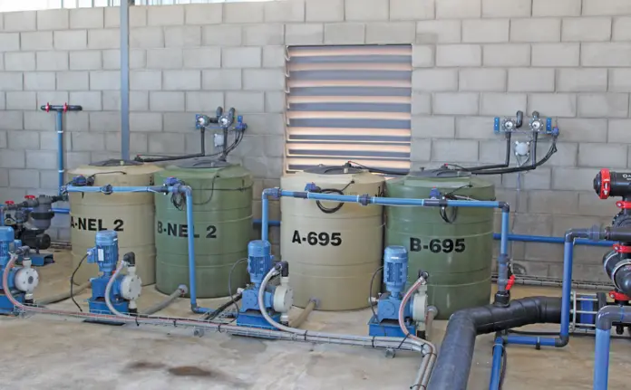 De Kock can set the a month’s fertigation programme digitally, and the elements are drawn from the tanks and mixed into the main tanks that fertigate the orchards.