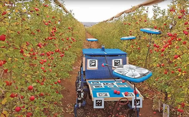 It is also equipped with sensors that guide it as it flies around the orchard, and suction tubes to gently pick the fruit without damaging it.