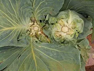 A mature infected plant may look normal apart from the colour, but if you cut through the stem you will find a ring of black tissue. This extends through the conducting tissue in the head. The head may be marketable but the customer is likely to complain once she has cut it open. The disease is more destructive in winter, with some areas being more affected than others.