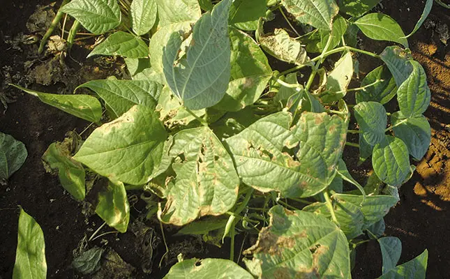 Symptoms include irregular brown patches on the leaves, especially along the edges, where there is a thinner border of yellow. As with halo blight, lesions appear on the pods, rendering them unmarketable.