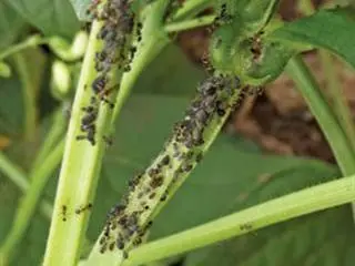 Green beans experience sporadic outbreaks of black aphids. Infection usually starts off as easy-to-spot patches in the land on a few plants alongside one another. Once again, you need to see how many beneficial insects are present before taking action. A high ladybird population will quickly take care of the problem. If there are only a few, or none (seldom the case), you can consider spot spraying. One worker with a knapsack can walk up and down the rows and spray only the infected areas with Pirimicarb.