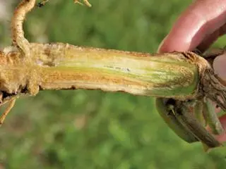 Often, only one side of the plant will wilt. When symptoms are severe, the stem near the ground will show browning of the conducting tissue when cut through. The roots may also become discoloured. This disease can be transmitted by seed. It can live in the soil for a long time and extended rotations are therefore advised – preferably up to eight years. It may not be necessary to wait this long, however. Make a note of the situation at harvest; if there are no symptoms of the disease, you should be able to plant sooner.