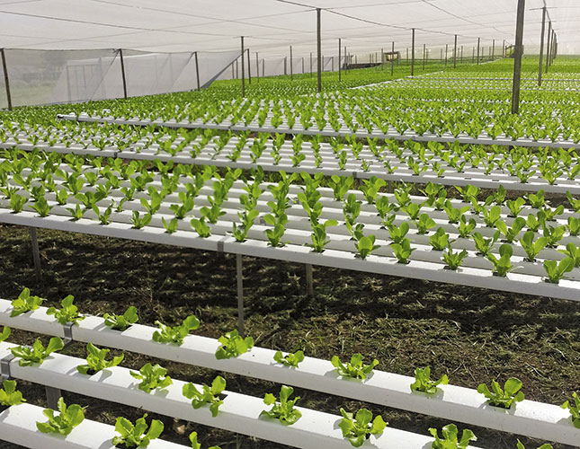 A lettuce-growing table consists of a hip-high steel framework carrying six gutters horizontally next to one another, with comfortable working spaces in between. The height of the tables allows the workers to harvest the lettuce standing up rather than bending over the ground. It also prevents soil from getting onto the lettuce.