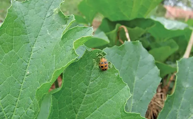 Farmers who have experienced damage from the potato ladybird need not be alarmed when they see the odd beetle on the foliage of their cucurbits. The two species (potato ladybird and cucurbit ladybird) look very similar but whereas the former is black with orange spots, the latter is orange with black spots.