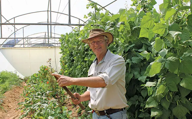 Geoffrey practises no-till and follows a rotation cycle that starts with mustard to produce green mulch, which is worked back into the soil. This is followed by tomato, beans and carrots, and then, after a fallow period, vegetables such as beetroot and kale.