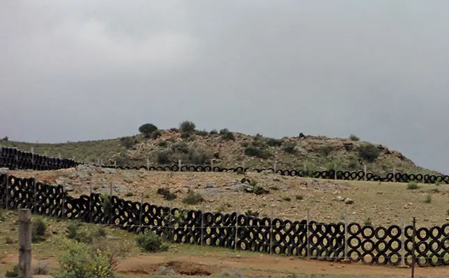Tyres can be arranged along the bottom of a fence to keep burrowing animals from digging holes that can in turn be used by predators such as jackal.